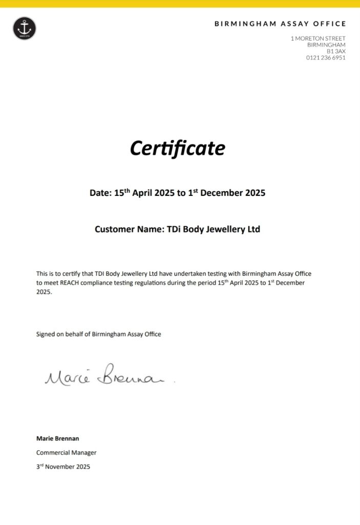 Additionally TDi Body Jewellery Ltd have in place a ‘due diligence’ system, as recommended by the Assay Office.